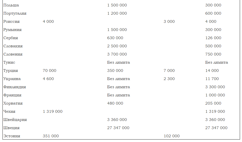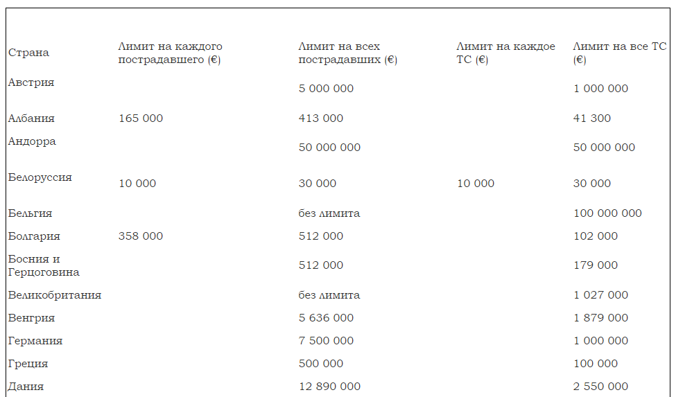 Получить информацию о лимитах по выплатам в странах, которые требуют при въезде на свои территории оформления «Зелёной карты», Вы сможете посредством таблицы, представленной ниже.